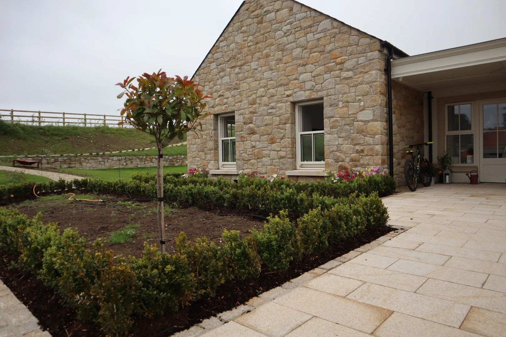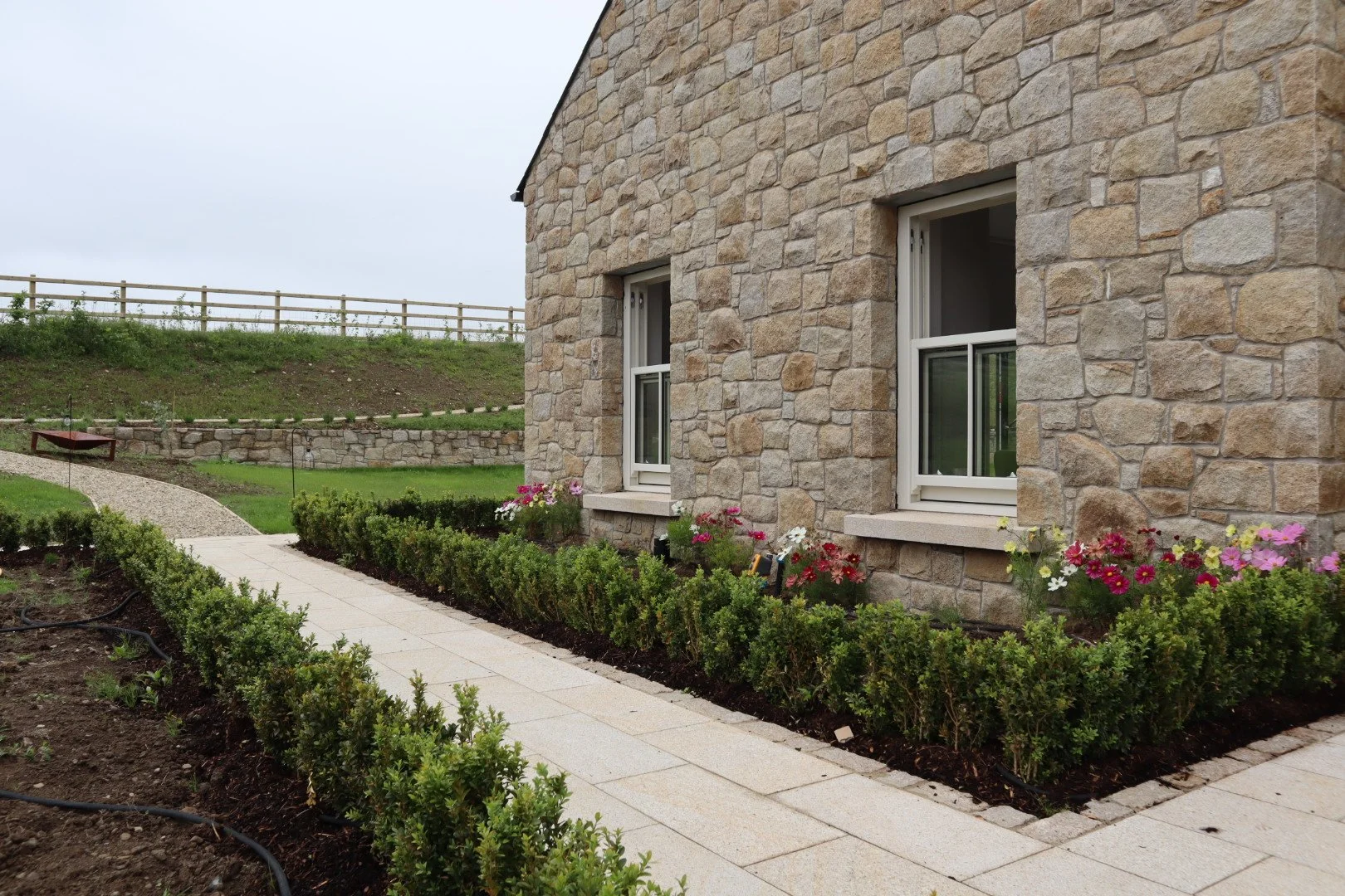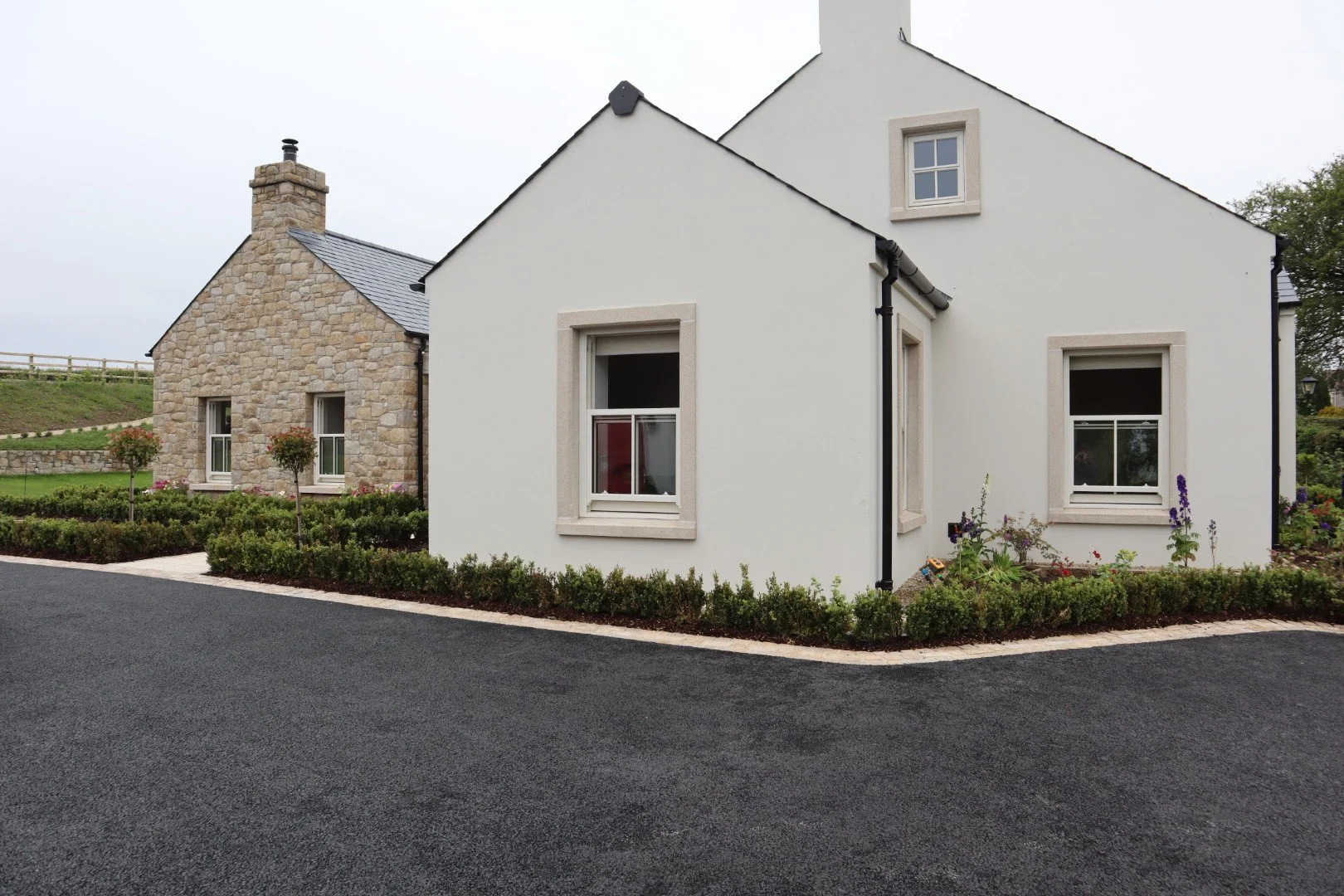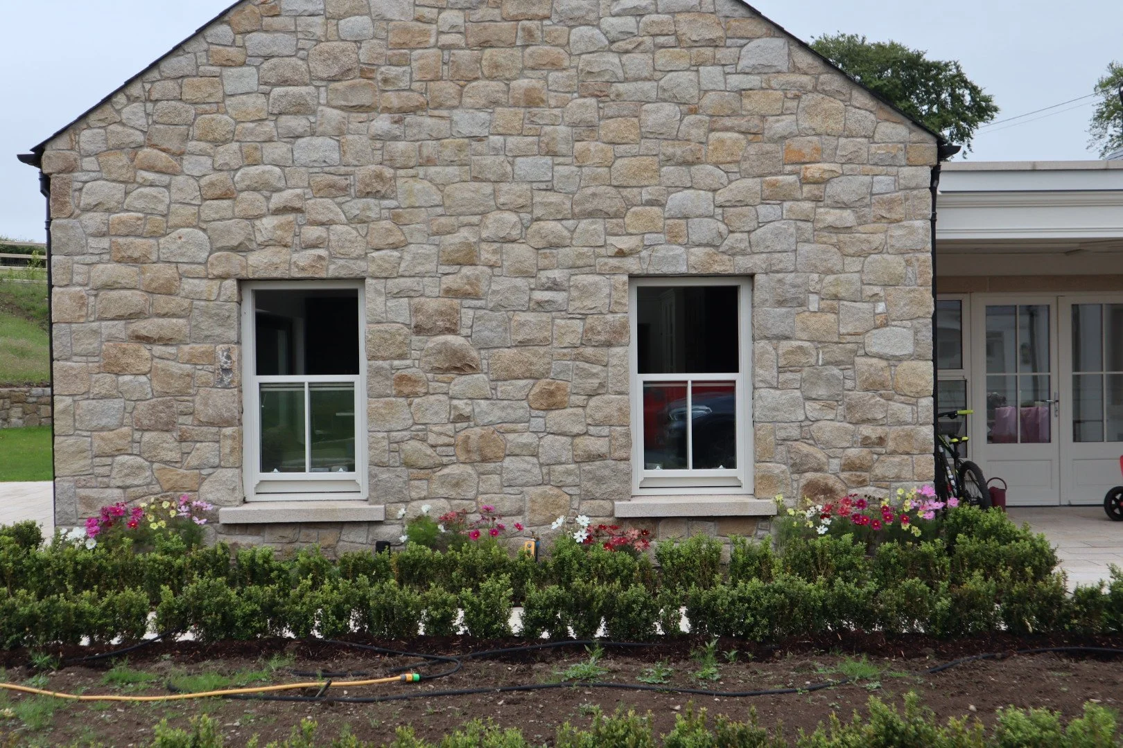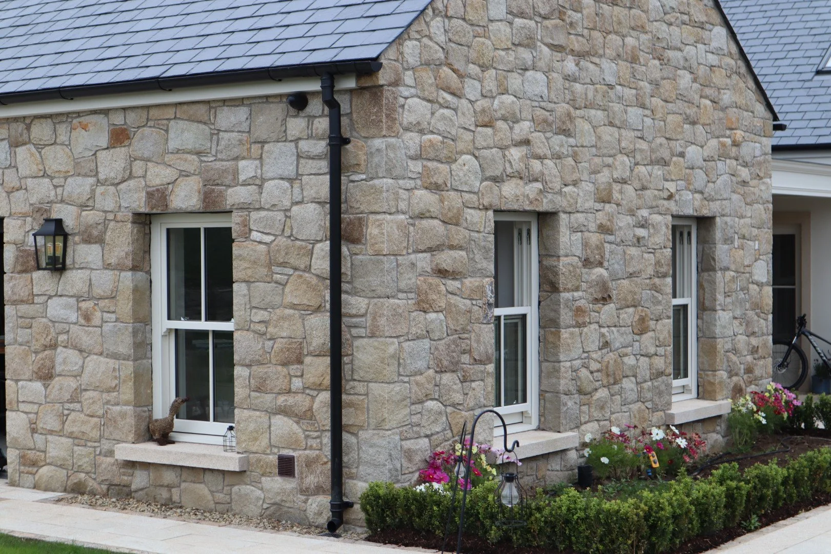 The Grey Granite helps to break up the build pattern and creates a contrast to the brown that allows the stone to marry in well with the other aspects of the house such as a grey granite step, grey dash and the plastered grey plinth.